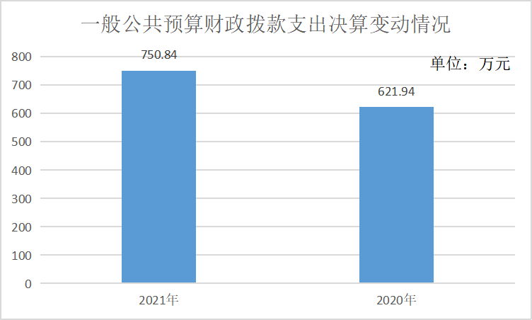 2021年一般公共预算财政拨款支出750.84万元,占本年支出合计的100%。与2020年相比,一般公共预算财政拨款支出增加128.9万元,增长20.72%。主要变动原因是编制内实有人数增加,导致人员基本支出及日常事务公用支出收支增加。