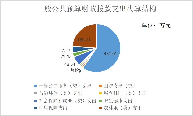 2021年一般公共预算财政拨款支出750.84万元,主要用于以下方面:一般公共服务(类)支出451.01万元,占60.06%;国防支出(类)0.8万元,占0.1%;节能环保(类)支出10.1万元,占1.35%;城乡社区(类)支出6.18万元,占0.82%;社会保障和就业(类)支出48.34万元,占6.44%;卫生健康支出21.43万元,占2.85%;住房保障支出32.27万元,占4.29%;农林水(类)支出180.71万元,占24.09%。