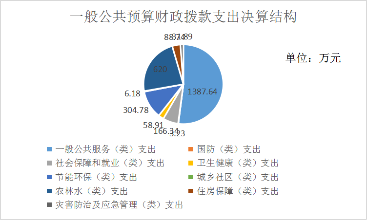 2021年一般公共预算财政拨款支出2667.7万元,主要用于以下方面:一般公共服务(类)支出1387.64万元,占52.02%;国防(类)支出3.23万元,占0.12%;社会保障和就业(类)支出166.34万元,占6.24%;卫生健康(类)支出58.91万元,占2.21%;节能环保(类)支出304.78万元,占11.42%;城乡社区(类)支出6.18万元,占0.23%;农林水(类)支出620万元,占23.24%;住房保障(类)支出88.74万元,占3.33%;灾害防治及应急管理(类)支出31.89万元,占1.2%。