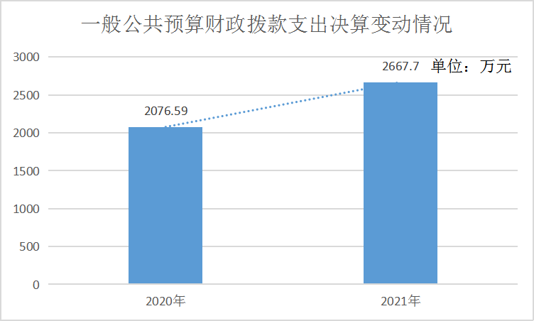 (二)部门财政资金支出情况。2021年公共预算一般支出2667.7万元,较2020年2076.59万元591.11万元,增长28.47%。