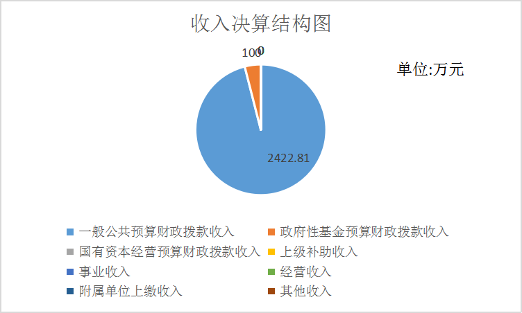 2021年本年收入合计2522.81万元,其中:一般公共预算财政拨款收入2422.81万元,占96.04%;政府性基金预算财政拨款收入100万元,占3.96%;国有资本经营预算财政拨款收入0万元,占0%;上级补助收入0万元,占0%;事业收入0万元,占0%;经营收入0万元,占0%;附属单位上缴收入0万元,占0%;其他收入0万元,占0%。