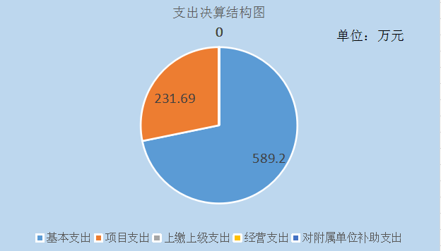 2021年本年支出合计820.89万元(含年初结转),其中:基本支出589.2万元,占71.78%;项目支出231.69万元,占28.22%;上缴上级支出0万元,占0%;经营支出0万元,占0%;对附属单位补助支出0万元,占0%。