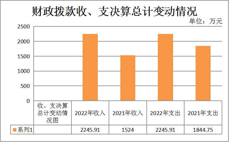 2022年度收入总计2245.91万元、支出总计2,245.91万元。与2021年相比,收入总计增加721.91万元,增长47.4%;支出总计增加401.16万元,增长21.7%。变动原因是人员变动,导致人员基本支出及日常事务公用支出收支增加。
