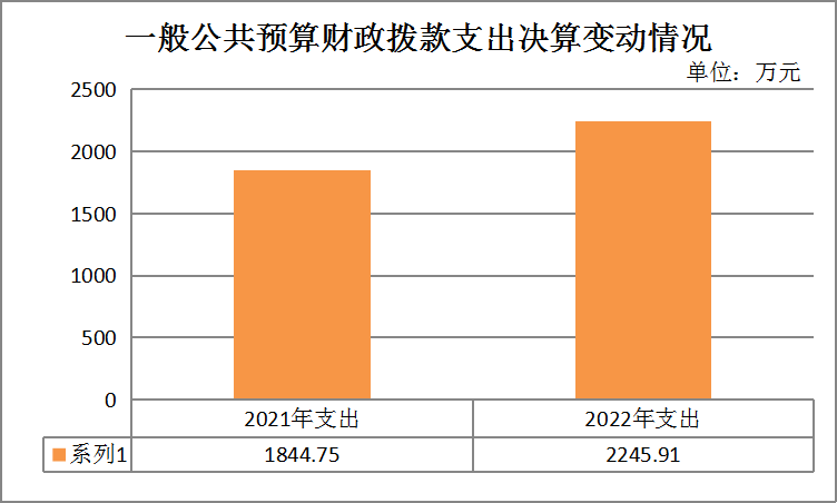 2022年一般公共预算财政拨款支出2245.91万元,占本年支出合计的100%。与2021年相比,一般公共预算财政拨款支出增加401.16万元,增长21.7%。主要变动原因是因项目增加,人员经费增加,工资调标等增加。