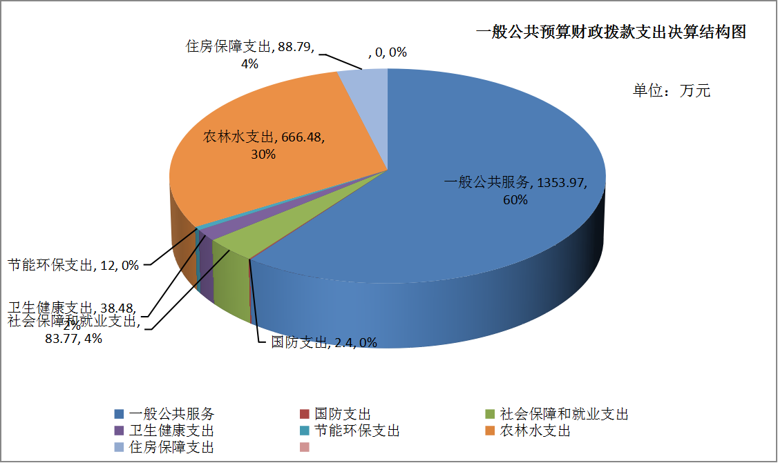 2022年一般公共预算财政拨款支出2245.91万元,主要用于以下方面:一般公共服务支出1353.97万元,占60.3%;国防支出2.4万元,占0.1%;社会保障和就业支出83.77万元,占3.7%;卫生健康支出38.48万元,占1.7%;节能环保支出12万元,占0.5%;农林水支出666.49万元,占29.7%;住房保障支出88.79万元,占3.95%。