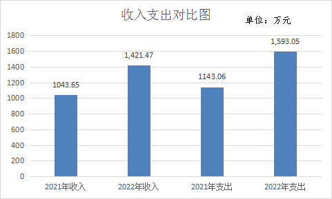 2022年度收入合计1421.47万元,与上年度1043.65万元相比,增长36.20%,上年结转171.58万元;2022年度支出合计1593.05万元,与2021年度1143.06万元相比,增长39.37%。主要变动原因是新进人员增加、公用经费调标及项目增加。