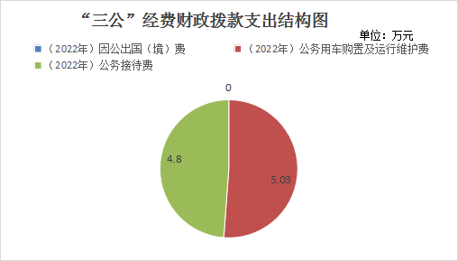 2022年“三公”经费财政拨款支出决算中,因公出国(境)费支出决算0万元,占0%;公务用车购置及运行维护费支出决算5.03万元,占51.17%;公务接待费支出决算4.8万元,占48.83%。具体情况如下: