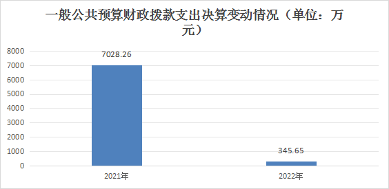 2022年一般公共预算财政拨款支出345.65万元,占本年支出合计的100%。与2021年相比,一般公共预算财政拨款支出减少6682.61万元,下降95.08%。主要变动原因是2021年存在财政偿还失地农民养老保险历年欠费项目,金额为6921.39万元,2022年无此项目。