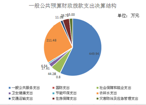 2022年一般公共预算财政拨款支出786.45万元,主要用于以下方面:一般公共服务支出449.94万元,占57.21%;国防支出0.80万元,占0.10%;社会保障和就业支出44.28万元,占5.63%;卫生健康支出17.61万元,占2.24%;节能环保支出6.54万元,占0.83%;农林水支出211.48万元,占26.89%;交通运输支出11.08万元,占1.41%;住房保障支出29.72万元,占3.78%;灾害防治及应急管理支出15.00万元,占1.91%。