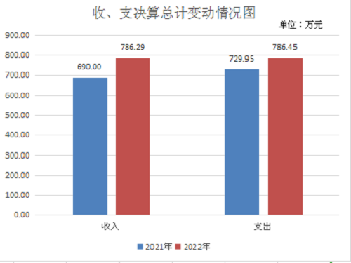 2022年度收入总计786.29万元、支出总计786.45万元。与2021年相比,收入总计增加96.29万元、支出总计增加56.5万元,分别增长13.96%、7.74%。主要变动原因是区划调整后我单位编制内实有人数增加,导致人员基本支出及日常事务公用支出收支增加。