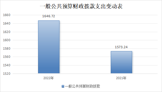 2022年一般公共预算财政拨款支出1646.72万元,占本年支出合计的100%。与2021年相比,一般公共预算财政拨款支出增加73.48万元,增长4.67%。主要变动原因是新进人员工资调资和公用经费调标及项目增加。