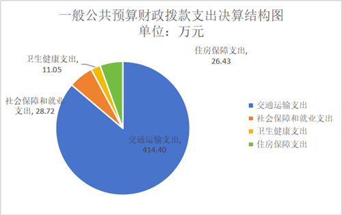 2022年一般公共预算财政拨款支出480.59万元,主要用于以下方面:交通运输支出414.40万元,占86.23%;社会保障和就业支出28.72万元,占5.98%;卫生健康支出11.05万元,占2.3%;住房保障支出26.43万元,占5.49%;。