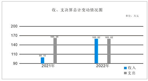 2022年度收入165.82万元、支出165.82万元。与2021年收入98.10万元、支出166.36万元相比,收增加67.72万元、支出减少0.54万元。主要变动原因是项目增加、人员减少。