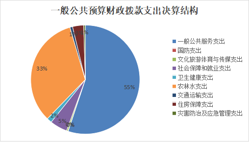 2023年度一般公共预算财政拨款支出1191.50万元,主要用于以下方面:一般公共服务支出656.53万元,占55.10%;国防支出0.80万元,占0.06%;文化旅游体育与传媒支出4.97万元,占0.42%;社会保障和就业支出61.57万元,占5.17%;卫生健康支出17.83万元,占1.50%;农林水支出395.57万元,占33.20%;交通运输支出9.46万元,占0.79%;住房保障支出39.17万元,占3.29%;灾害防治及应急管理支出5.60万元,占0.47%。