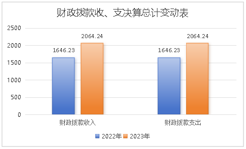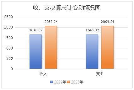 2023年度收、支总计均为2064.24万元。与2022年度相比,收、支总计各增加417.92万元,增长25.38%。主要变动原因是人员调资和公用经费调标及项目增加。