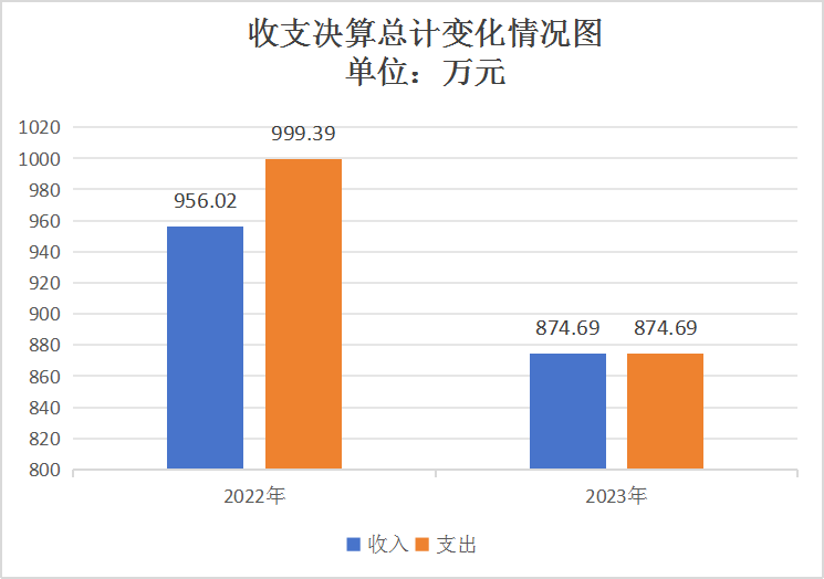 2023年度收入总计874.69万元、支出总计874.69万元。与2022年度相比,收入总计减少81.33万元,下降8.5%。、支出总计减少124.7万元,下降12.5%。主要变动原因是2023年各项基本支出、项目类支出少于2022年的各项基本支出、项目类支出。