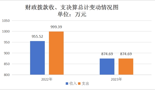 2023年度财政拨款收入总计874.69万元、支出总计为874.69万元。与2022年度相比,财政拨款收入总计减少80.83万元,下降8.5%、支出总计减少124.7万元,下降12.5%。主要变动原因是2023年各项基本支出、项目类支出少于2022年的各项基本支出、项目类支出。