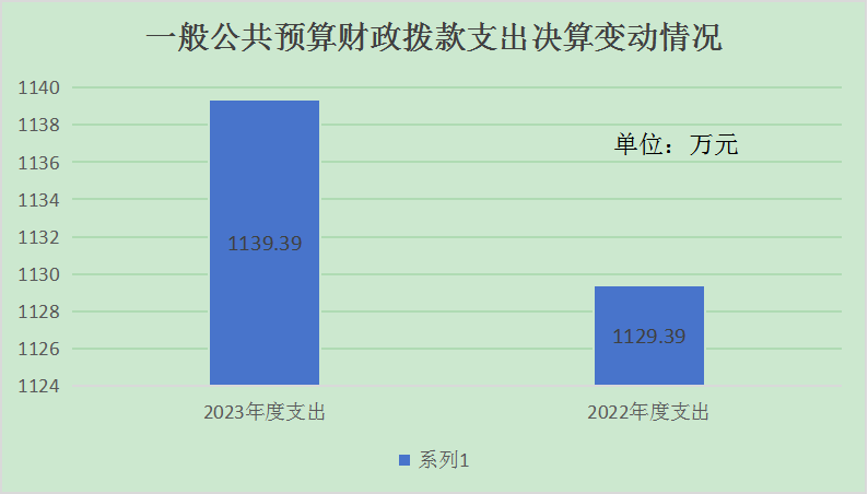 2023年度一般公共预算财政拨款支出1139.39万元,占本年支出合计的100%。与2022年度相比,一般公共预算财政拨款支出增加10万元,增长0.9%。主要变动原因是项目增加,人员经费增加,工资调标等增加。