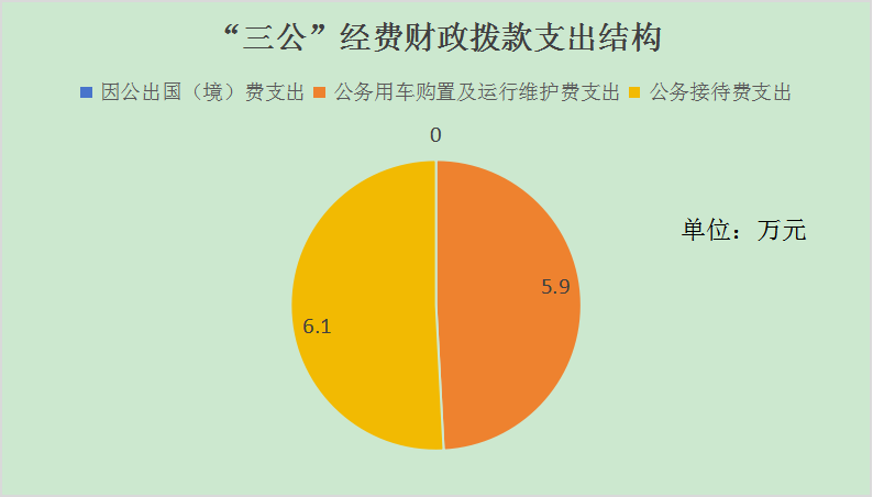 2023年度“三公”经费财政拨款支出决算中,因公出国(境)费支出决算0万元,占0%;公务用车购置及运行维护费支出决算5.9万元,占49.2%;公务接待费支出决算6.1万元,占50.8%。具体情况如下:
