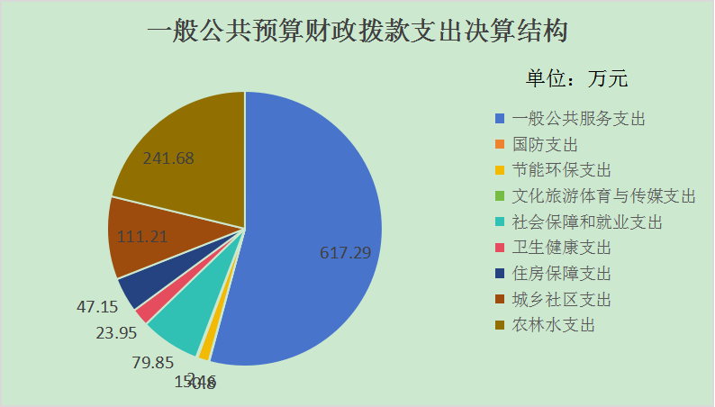 2023年度一般公共预算财政拨款支出1139.39万元,主要用于以下方面:一般公共服务支出617.29万元,占54.2%;国防支出0.8万元,占0.1%;节能环保支出15.46万元,占1.4%;文化旅游体育与传媒支出2万元,占0.2%;社会保障和就业支出79.85万元,占7%;卫生健康支出23.95万元,占2.1%;住房保障支出47.15万元,占4.1%;城乡社区支出111.21万元,占9.8%;农林水支出241.68万元,占21.2%。