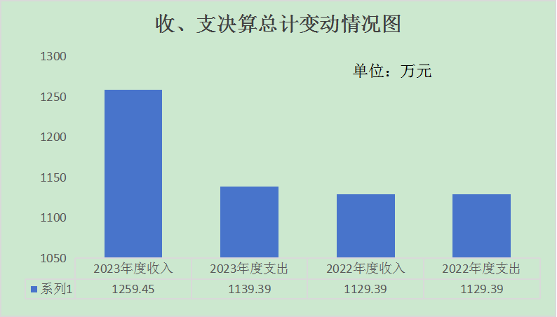 2023年度收、支总计为1259.45万元、1139.39万元。与2022年度相比,收、支总计各增加130.06万元、10万元,分别增长11.5%、0.9%。主要变动原因是项目增加,人员经费增加,工资调标等增加。