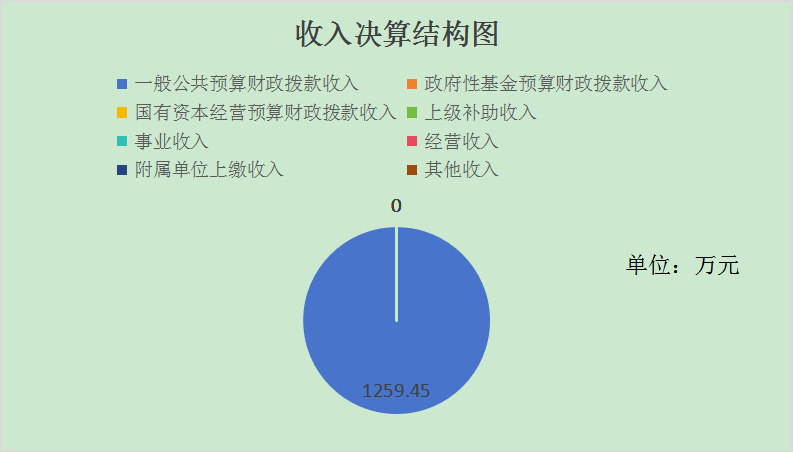 2023年度本年收入合计1259.45万元,其中:一般公共预算财政拨款收入1259.45万元,占100%;政府性基金预算财政拨款收入0万元,占0%;国有资本经营预算财政拨款收入0万元,占0%;上级补助收入0万元,占0%;事业收入0万元,占0%;经营收入0万元,占0%;附属单位上缴收入0万元,占0%;其他收入0万元,占0%。