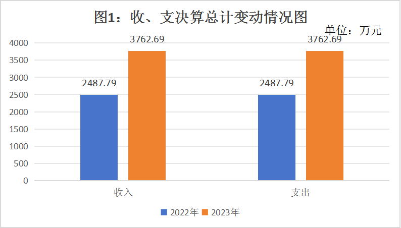 2023年度收、支总计均为3762.69万元。与2022年度相比,收、支总计各增加1274.9万元,增长51.2%。主要变动原因是增加重大项目:清江河水质保障工程项目。