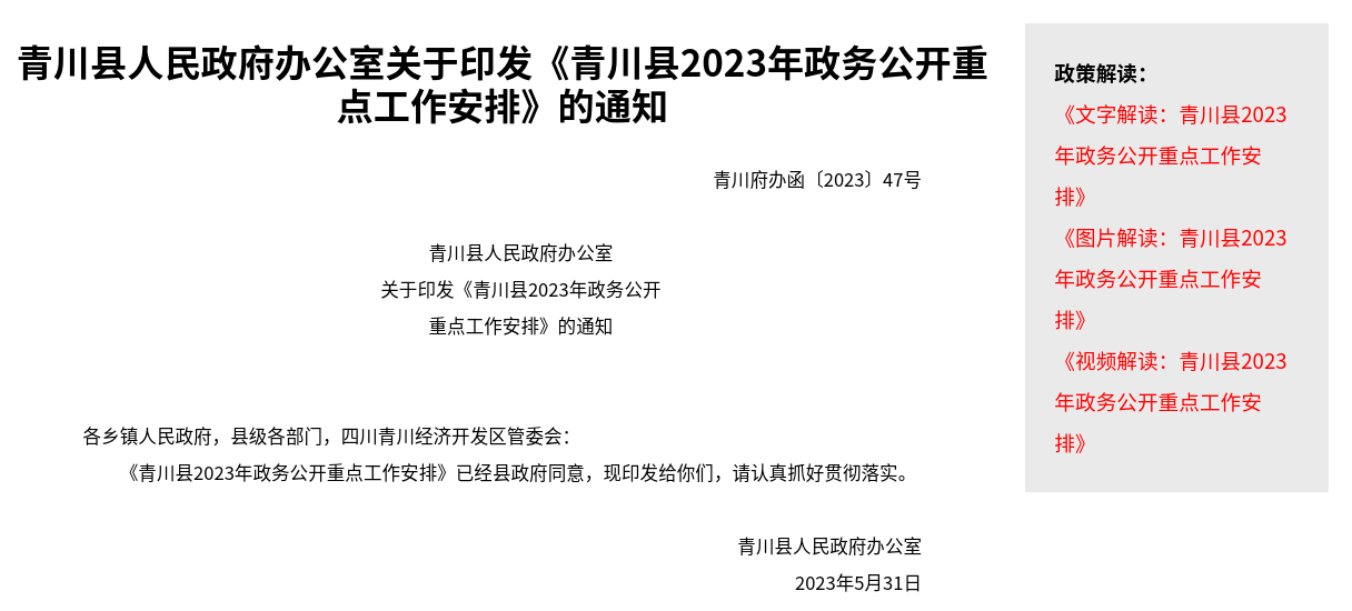 2023年,青川县坚持以习近平新时代中国特色社会主义思想为指导,全面贯彻落实党的二十大精神和省市关于政务公开工作决策部署,紧紧围绕县委、县政府中心工作,以政务公开重点工作为抓手,不断深化基层政务公开,提升基层政府治理能力,切实保障人民群众知情权、参与权、表达权和监督权。