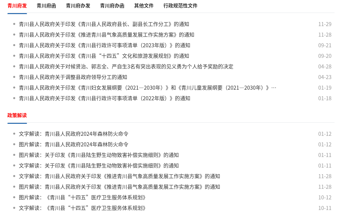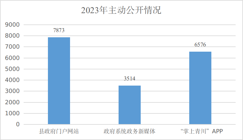 (一)主动公开情况。2023年,在县政府门户网站累计发布主动公开信息7873条,包括工作动态、规划计划、人事及招考等基本领域信息4756条,稳岗就业、养老服务、义务教育、医疗卫生、住房保障等重点领域信息2684条。公开政府文件48个,其中规范性文件3个,发布文字、图片、音视频政策解读34条,解读率100%。公开财政预决算和“三公”经费信息327条。通过县政府门户网站征集民意9期,开展在线访谈9期,办理公众咨询23件。公开常务会议信息17条,人大代表建议和政协委员提案107件。全县政府系统政务新媒体发布信息3514条,“掌上青川”APP发布信息6576条。