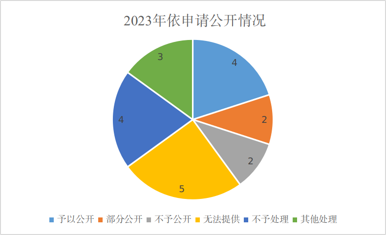 (二)依申请公开情况。畅通依申请公开渠道,健全依申请公开答复机制,规范依申请公开事项办理程序,严格登记、审核、办理答复归档,及时依法向群众公开申请内容,不断提高政府信息依申请公开工作水平。2023年,通过网上和信件方式收到公民、企业依申请公开政府信息20件,其中予以公开4件,部分公开2件,不予公开2件,无法提供5件,不予处理4件,其他处理3件,全部按期办结。